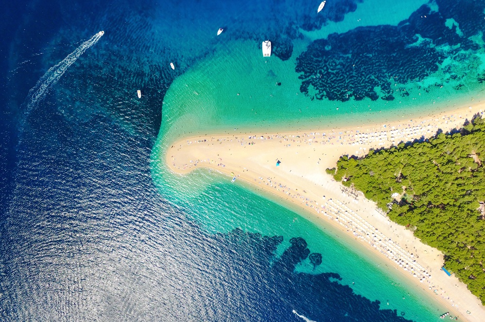 Met zo’n 175 kilometer kustlijn valt er hier eindeloos veel te ontdekken. Verwacht geen brede zandstranden, maar kleine baaien met witte kiezels en water dat zo helder is dat je op vijf meter diepte nog steeds de bodem ziet. Geen zand tussen je tenen, maar wel ligbedden, een parasol en een ijskoude espresso (of iets anders) binnen handbereik. Dat voelt als pure luxe.Een absoluut hoogtepunt is Zlatni Rat, bij het plaatsje Bol. Dit iconische strand, ook wel de Gouden Hoorn genoemd, verandert voortdurend van vorm door wind en stroming. De punt wijst de ene dag naar links, de andere naar rechts. Het is een fascinerend natuurverschijnsel en niet voor niets een van de meest gefotografeerde stranden van Kroatië. Onder de dennenbomen langs de rand van het strand vind je schaduw en rust, terwijl de zee hier perfect is om te zwemmen, te suppen of te windsurfen.