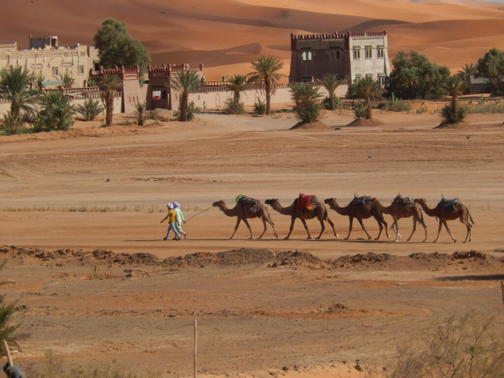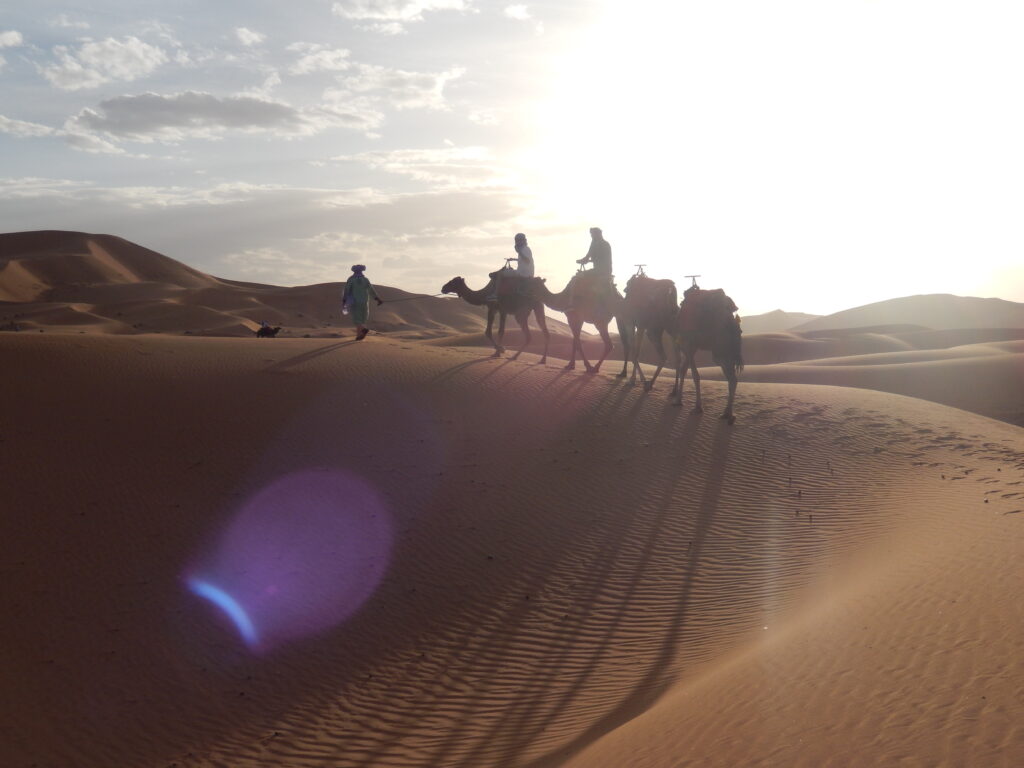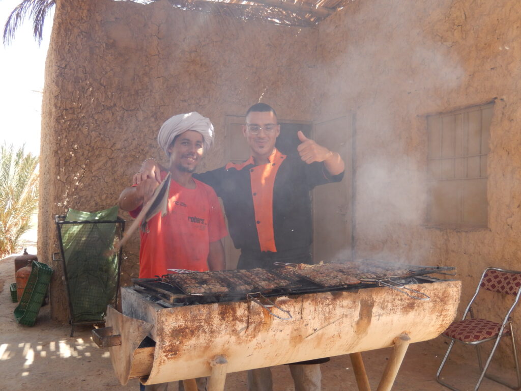 Onderweg naar onze lunchlocatie zien we dromedarissen staan. Ze knabbelen aan het gras dat hier en daar uit de grond steekt. Het is een prachtig gezicht en eigenlijk precies zoals ik me de woestijn voorafgaand aan de reis had voorgesteld. Langzaam verandert de stenen bodem in oranje zand. De chauffeur stuurt ons behendig door de duinen tot we de groene rand van een oase bereiken. Midden in de woestijn ligt Mines of M’lfis, een restaurant opgebouwd uit tenten en Perzische kleden. De geur van gekruid vlees komt ons al tegemoet. We eten en drinken heerlijk. Antoine Marthoz van communicatiebureau Insticom vertelt dat Marokko meer toeristen naar de woestijn wil trekken. “Toeristen gaan nu voornamelijk naar Marrakesh en Casablanca. Hoewel die plekken prachtig zijn, willen ze laten zien dat Marokko zoveel meer te bieden heeft. Veel mensen weten niet dat dit ook een optie is.”