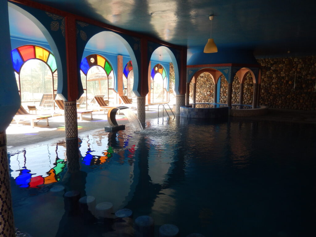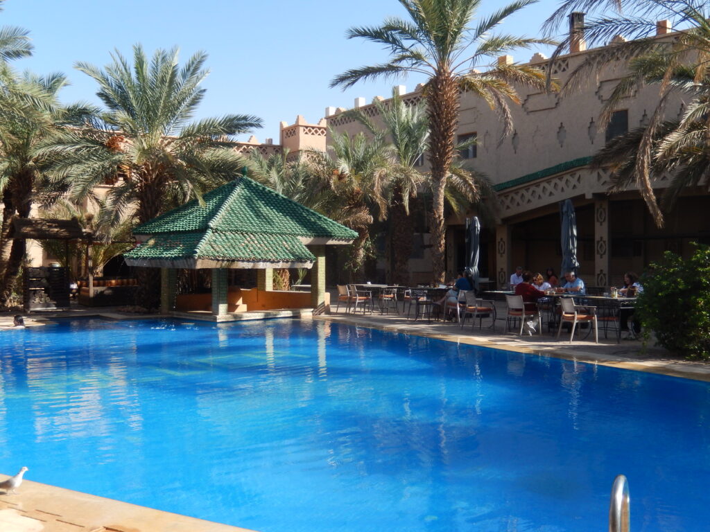 De vlucht naar Casablanca duurt drieënhalf uur, waarna we overstappen op een klein toestel richting Errachidia. Vanaf daar rijden we naar het Kasbah Xaluca Maadid & Spa Hotel. Het is ongeveer 1.00 uur ’s nachts als ik in mijn hotelkamer aankom. De kamer is prachtig en groot. Op de bijzettafel staat een heerlijk diner voor me klaar: rijst, maïs, gegrilde kip, wat groente en Marokkaanse koekjes. Als ik uiteindelijk in bed lig, valt me pas op hoe mooi de kamer is ingericht. Net als de rest van het hotel heeft het gekleurde ramen en is er overal aandacht voor details, zoals de houten deuren en de fossielen in de stenen wastafel.