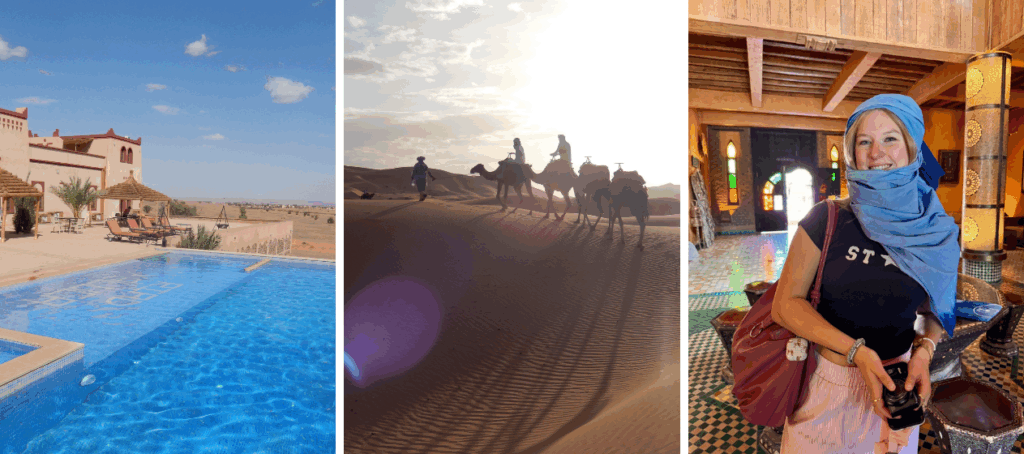Terug in het hotel trakteer ik mezelf op een hamam-behandeling: scrub, massage en totale ontspanning. Terwijl ik terugloop naar mijn kamer, barst er plotseling een regen- en zandstorm los. Zelfs de woestijn kent onstuimig weer. Als de lucht weer opklaart, genieten we van onze laatste avond samen. Onder de aangename avondtemperatuur drinken we wijn op het terras, praten we na en kijken naar de sterren. Zo sluiten we deze bijzondere reis door de Marokkaanse woestijn af.