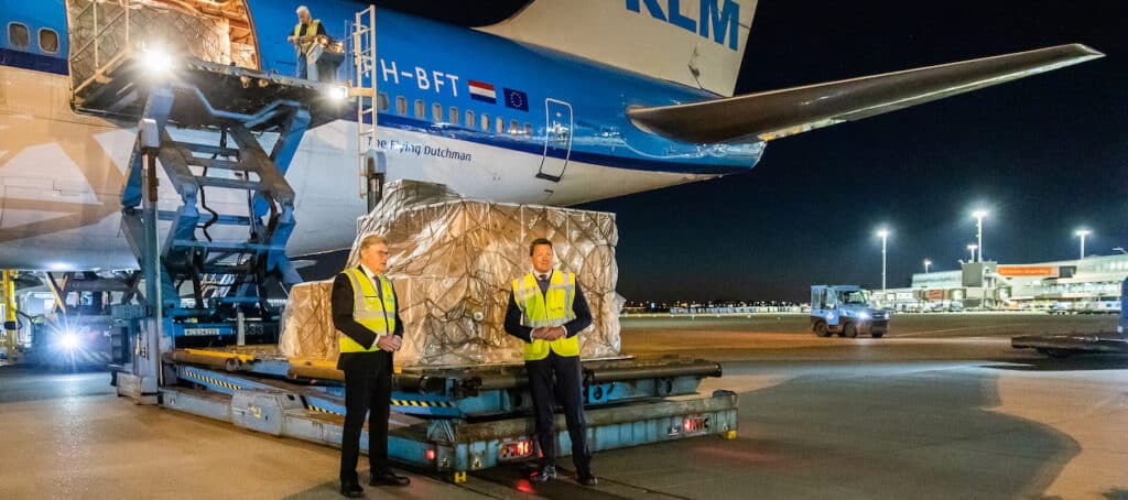In het bijzijn van Minister Martin van Rijn (Volksgezondheid, Welzijn en Sport) en President & CEO Pieter Elbers van KLM, werden de hulpgoederen uitgeladen en klaar gezet voor verdere distributie naar Nederlandse zorginstellingen in de strijd tegen corona. KLM heeft voor deze belangrijke vrachtluchtbrug de komende zes tot acht weken speciaal de Boeing 747-combi teruggebracht in de operatie. De bijna dagelijkse vluchten zorgen voor een continue stroom van medische benodigdheden vanuit China naar Nederland.