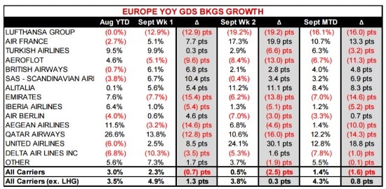 In het document staat onder andere dat het aantal Lufthansa Group boekingen in Europa via GDS (Sabre, Travelport en Amadeus) in de eerste twee weken van september is afgenomen met 16,1% in vergelijking met vorig jaar. Lufthansa was in die eerste twee weken van september wel genoodzaakt om meer dan 1000 vluchten te cancelen door pilotenstakingen op 8 en 9 september. Opvallend genoeg was het aantal boekingen in augustus via GDS in vergelijking met vorig jaar niet afgenomen. Uiteraard zouden andere airlines volgens het document profiteren van de daling van het aantal geboekte tickets bij Lufthansa Group.