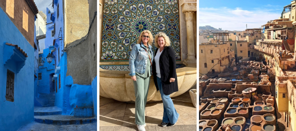 Foto boven v.l.n.r.: Chefchaouen, Hanita van der Meer en Marion Ariëns bij de Hassan II-moskee in Casablanca en leerlooierijen in Fez.