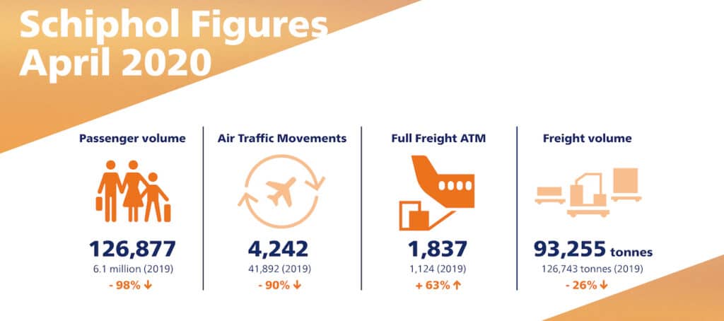 Als gevolg van de crisis is het aantal vluchten van en naar Schiphol in april met 90% gedaald ten opzichte van dezelfde maand vorig jaar, tot in totaal 4.242 vluchten. Dit resulteerde in 126.877 passagiers die van, naar of via Schiphol reisden, tegenover 6.1 miljoen reizigers in april 2019. Dit is een afname in passagiers van 98%.