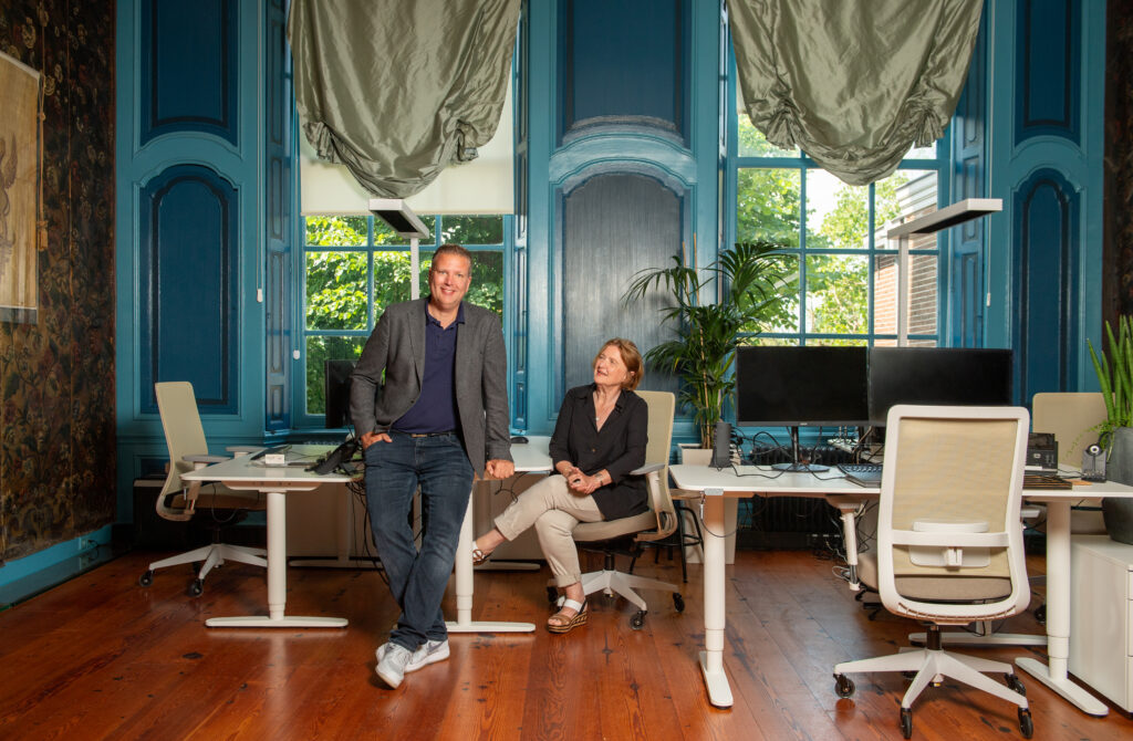 “We zijn letterlijk klein begonnen”, zegt Jur. “Vanuit het huis van mijn ouders, maar na vier jaar groeiden we daaruit. We konden het samen niet meer aan. Onze eerste medewerker, Irene Dijkstra, kwam erbij en zij werkt nog steeds bij ons. Daarna verhuisden we naar het centrum van ons oude stadje, waar we na twee jaar opnieuw tegen ruimtegebrek aanliepen. In 2006 kregen we de unieke kans om een etage van het voormalige stadhuis van Monnickendam te huren. Inmiddels werken we in het hele pand. Hier liggen eigenlijk onze roots, en het gebouw past precies bij wie we zijn: we houden van historie, authenticiteit en een persoonlijke sfeer. Met ruim vijftig medewerkers is het soms wel even passen en meten, maar gelukkig is er een mooie oplossing voor het ruimtegebrek in zicht.”